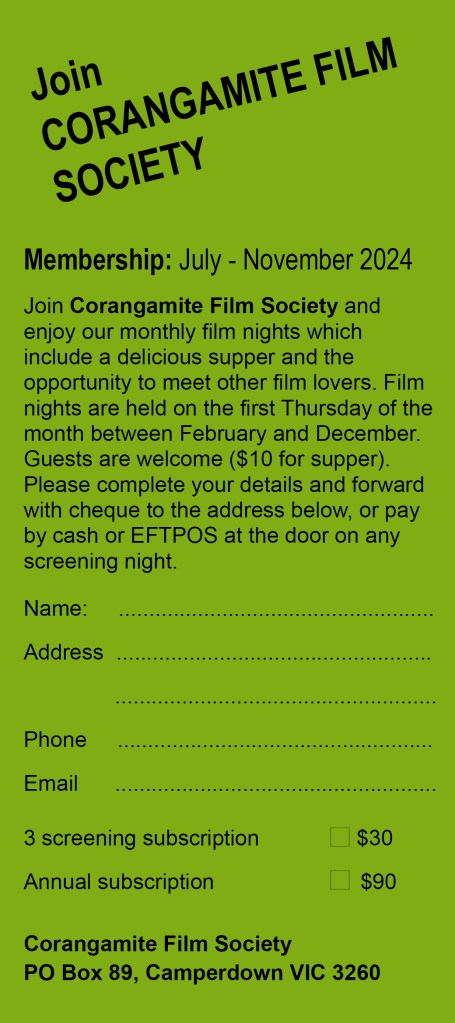 Become a member of Corangamite Film Society and enjoy our monthly film nights which include a delicious supper after the film and the opportunity to meet other film lovers. View our current program on this page to find out which films are planned for the rest of the year.